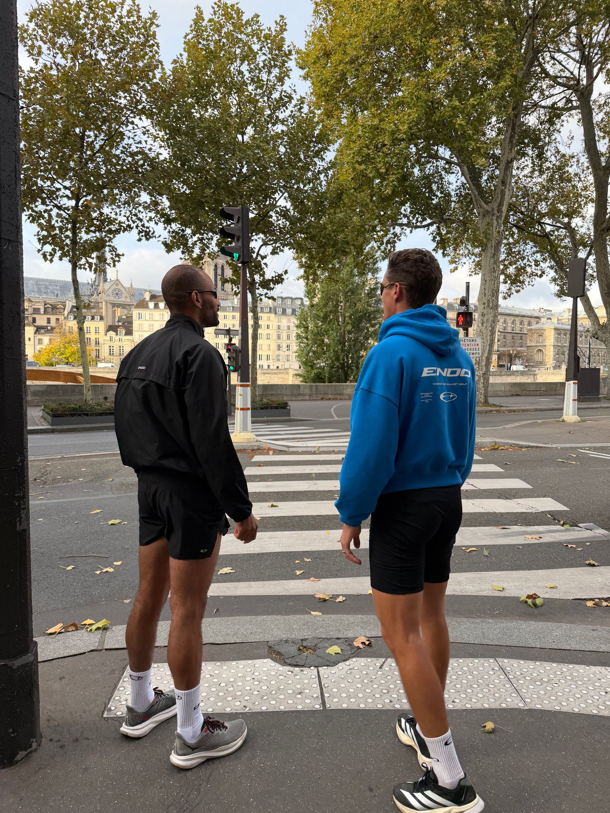 Drop shoulder design, with a cropped waist to protect our favorite silhouette of an oversized hoodie. Boasting Endo’s cobalt blue. Graphics screen printed to chest and back.